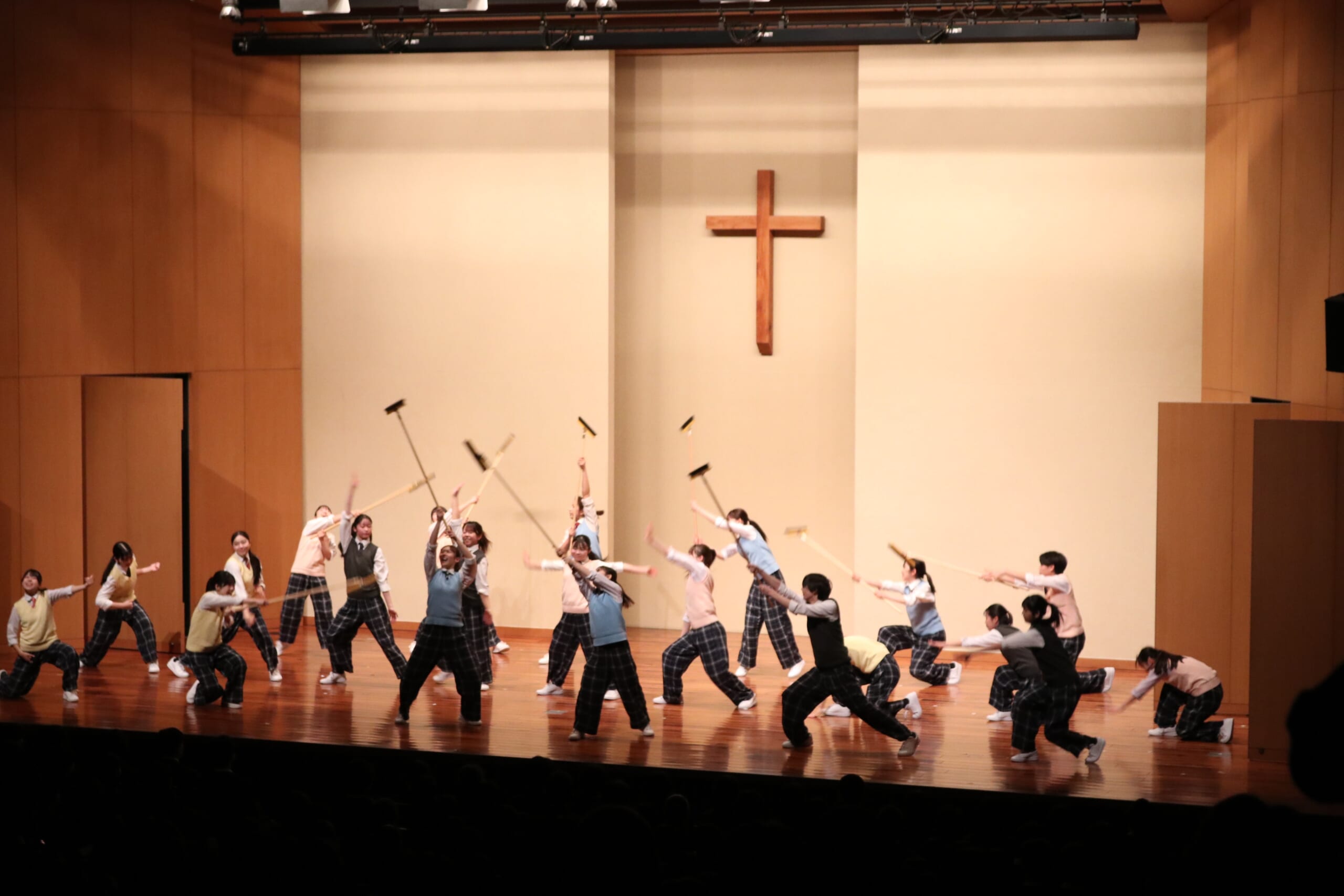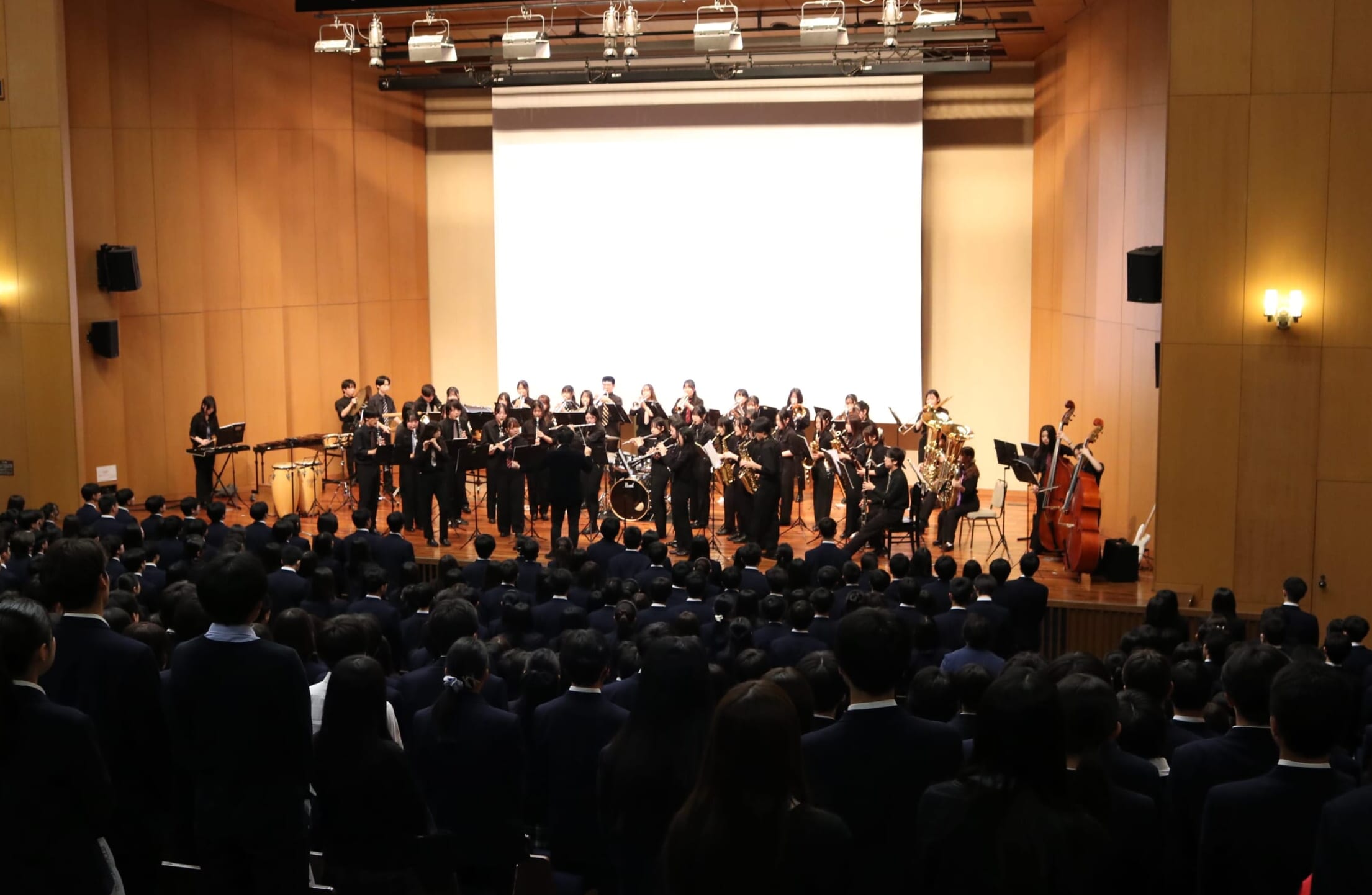 第1部はチアリーディング部の演技、行事や生徒会活動の紹介、ダンス部の演技、ブラスバンド部の演奏が行われました。