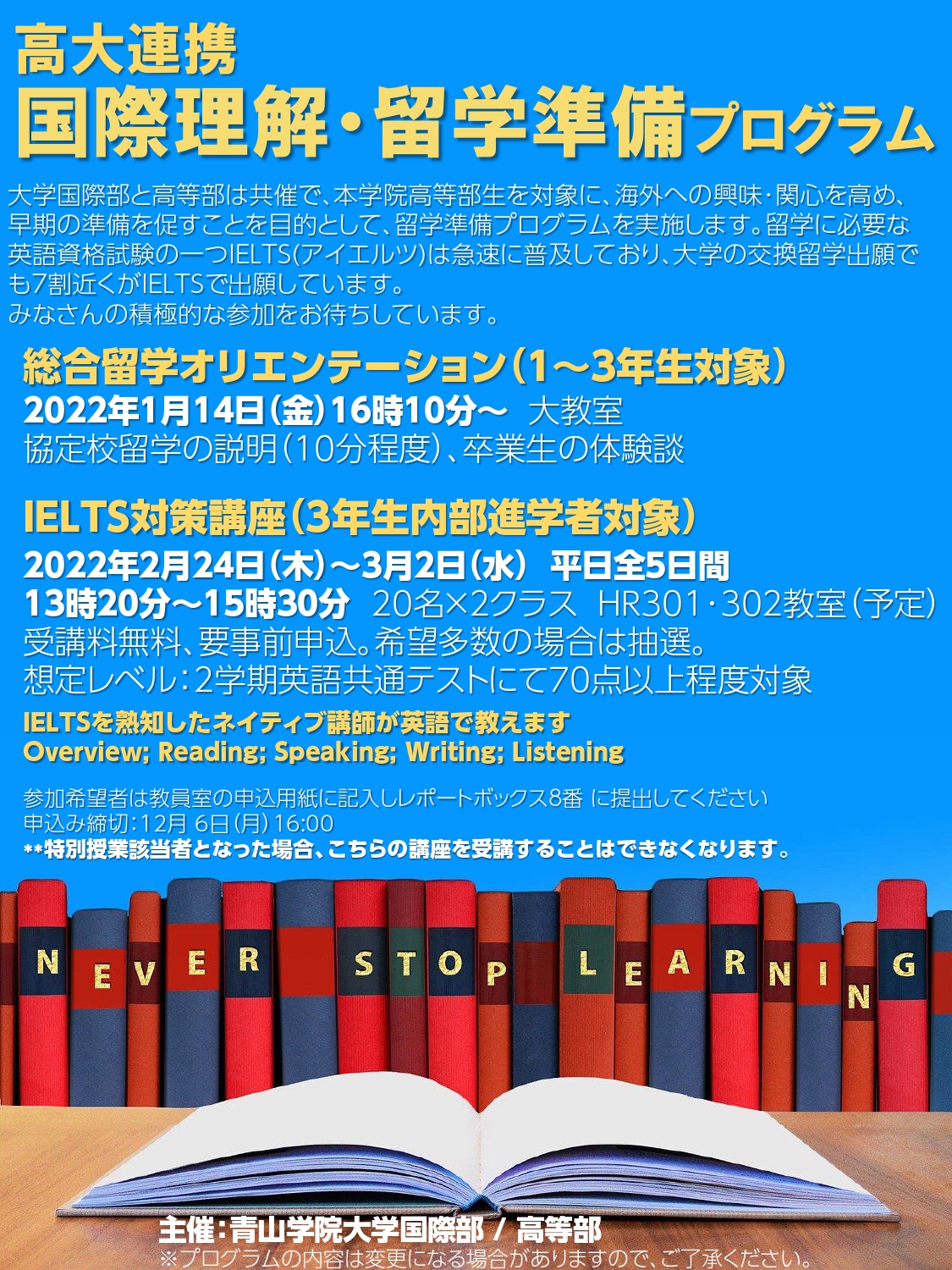 2022年2月24日~3月2日には、大学での協定校留学についてのオリエンテーションと応募する際の資格となるIELTSの対策講座を行いました。