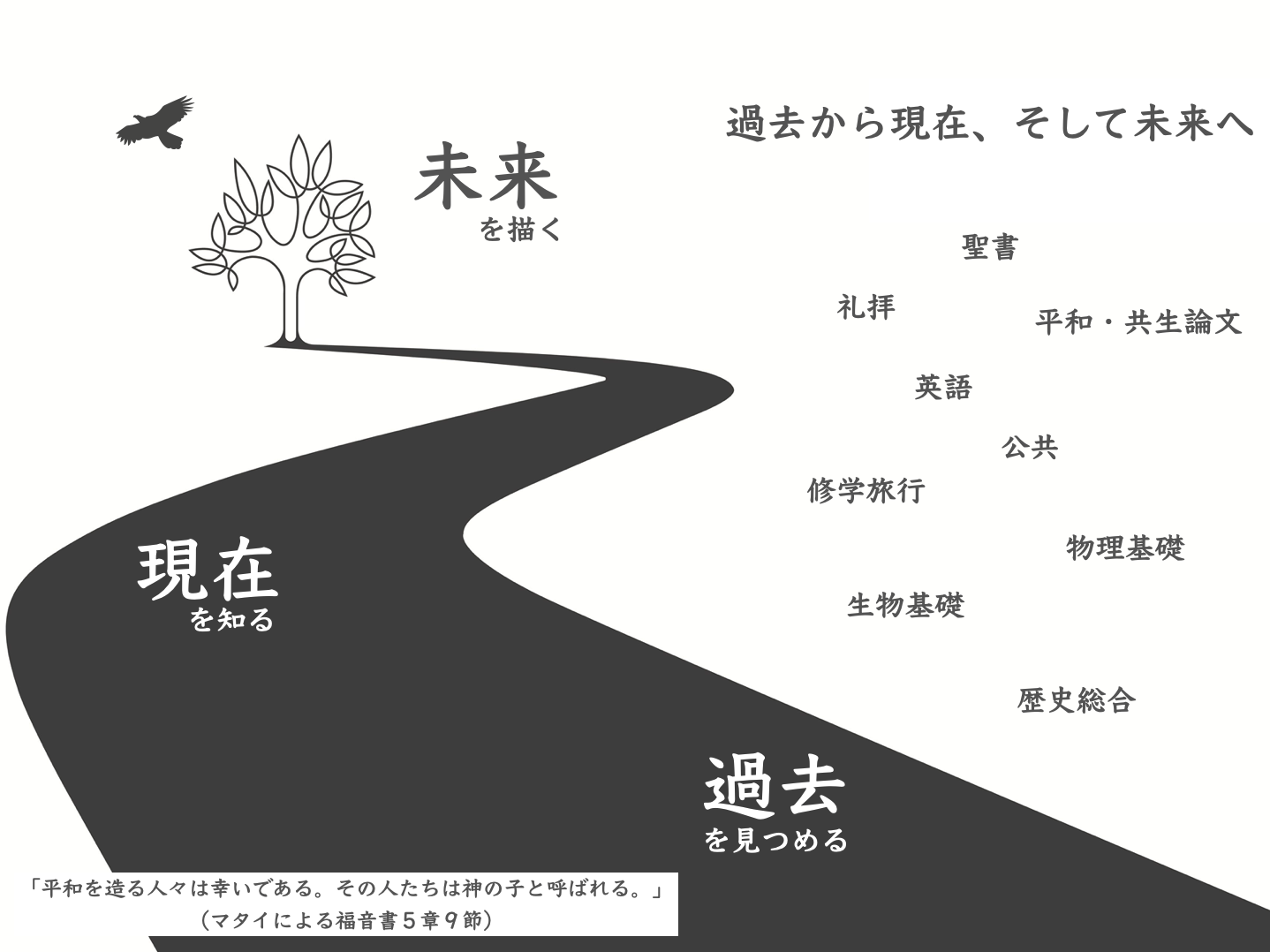 その基礎づくりとして、「過去を見つめる」「現在を知る」「未来を描く」という共通テーマの下、様々な教科を横断した総合的な平和・共生学習の記録ノート(学習ノート)である「LogBook」を制作し、生徒一人ひとりが平和の実現者となるべく、学習活動を行っています。
