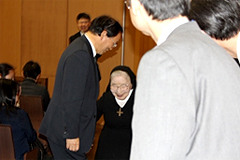 はじめに、100万部を超えるベストセラー『置かれた場所で咲きなさい』の著者でもある渡辺和子ノートルダム清心学園理事長から、50分間にわたって「子育て」「キリスト教学校の意義や意味」等についての特別講演が行われました(於:本校PS講堂)。