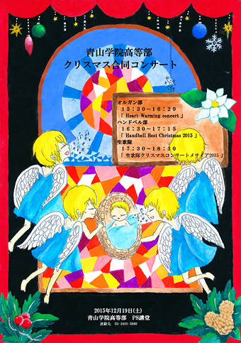 青山学院高等部では今年も、学校がその活動を支援している「特設クラブ」であるオルガン部・ハンドベル部・聖歌隊がそれぞれの音楽演奏を通してクリスマスをお祝いするという趣旨のもと、クリスマス合同コンサートを開催いたします。