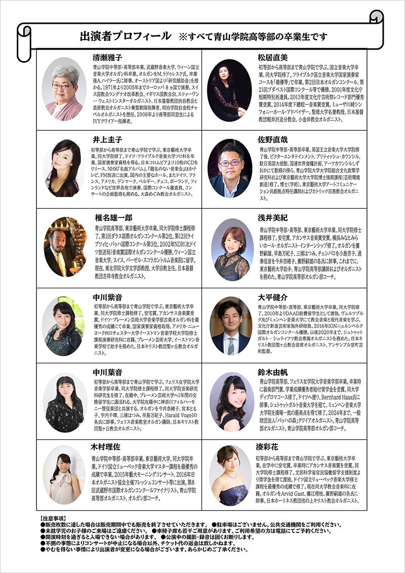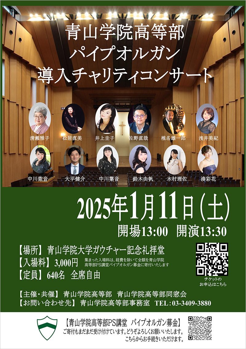 なお、集まった入場料は、経費を除いた全額を青山学院高等部PS講堂パイプオルガン募金に寄付いたします。